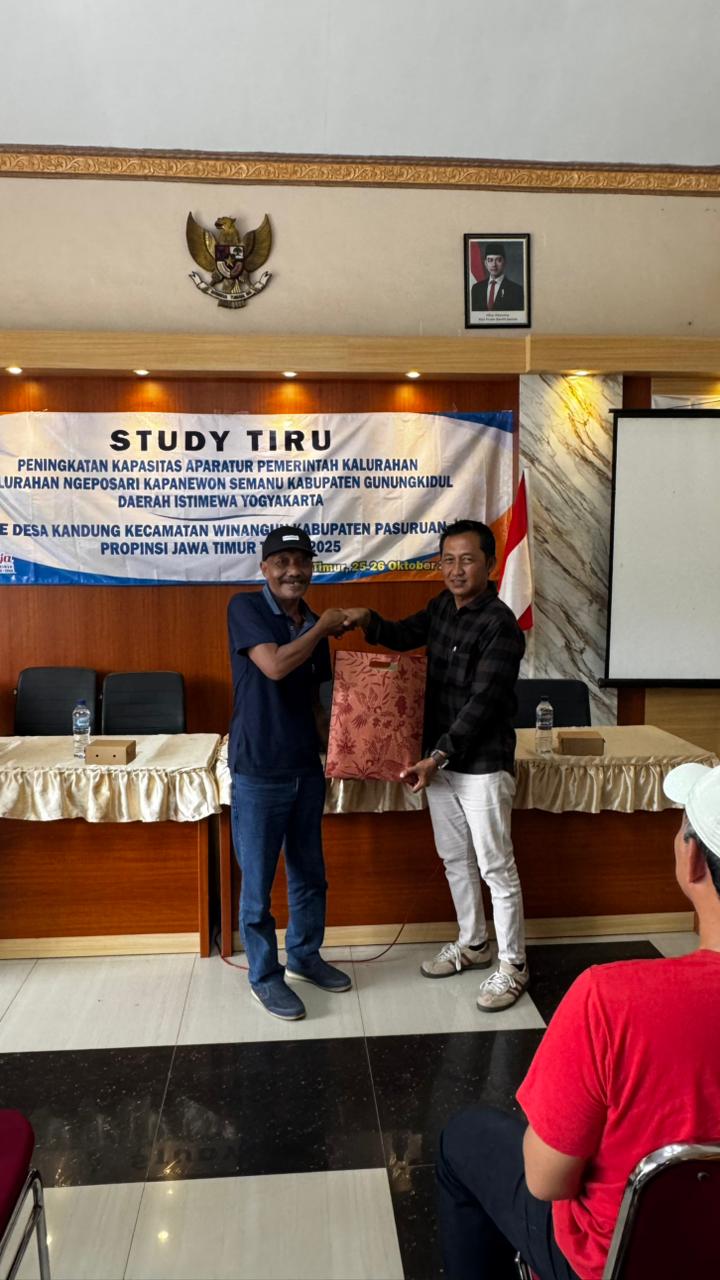 Tujuan dari kegiatan study tiru ini adalah menambah wawasan dan pengetahuan serta pengalaman dalam peningkatan kapasitas aparatur pemerintah desa yang efektif, inovatif dalam pelayanan masyarakat. Jika dalam penyambutan ini terdapat kekurangan, kami mohon maaf yang sebesar – besarnya. Semoga dalam pertemuan ini membawa maanfaat bagi kita semua dan menyambung tali silaturrahmi antara Pemerintah Desa Kandung Kecamatan Winongan Kabupaten Pasuruan Jawa Timur dengan Kalurahan Ngeposari Kapanewon Semanu Kabupaten Gunungkidul Daerah Istimewa Yogyakarta.