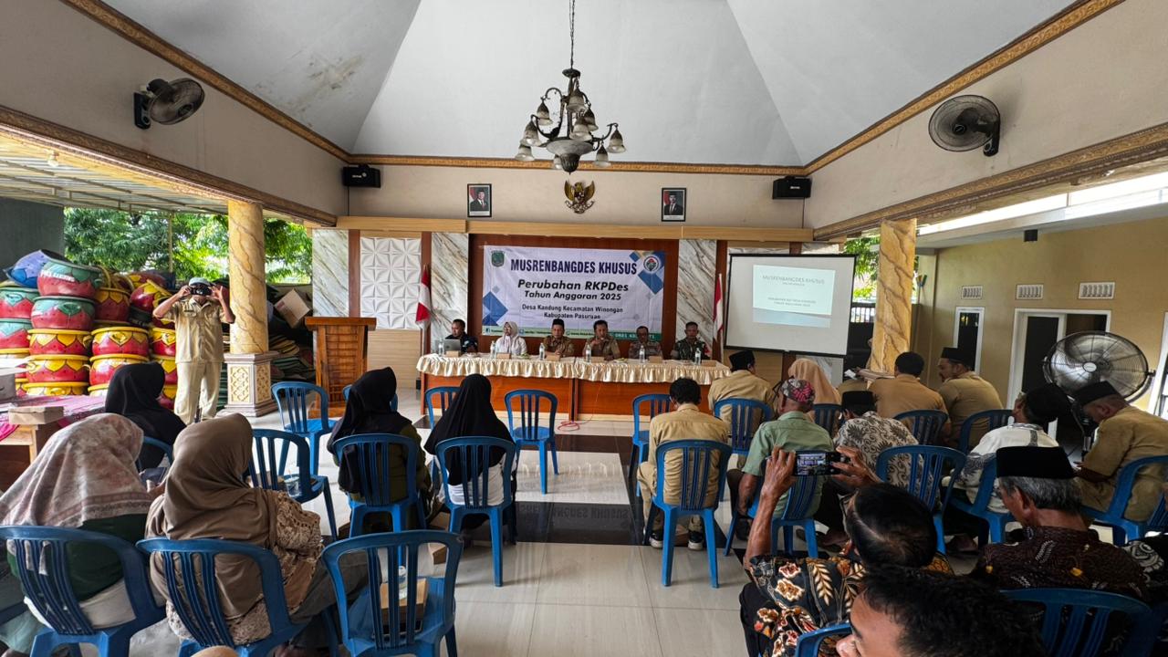 Pemerintah Desa Kandung telah melaksanakan kegiatan MUSRENBANGDES KHUSUS Perubahan RKPDes Tahun Anggaran 2025 pada hari Selasa, 04 November 2025 yang bertempat di Balai Desa Kandung. Kegiatan tersebut dihadiri oleh tim Kecamatan Winongan, Kapolsek Winongan, Danramil Winongan, Pendamping Lokal Desa, Kepala Desa Kandung beserta Perangkat dan Staffnya, BPD, RT, RW, dan Warga Masyarakat Desa Kandung.